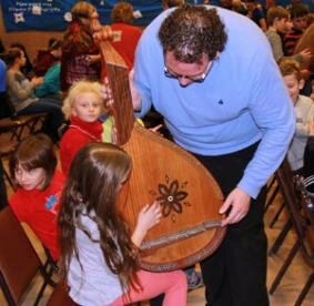 Усе відбулося інтерактивно, тобто, ми всі – глядачі і слухачі – взяли участь у концерті, у вправах, у співах, в навчанні! Так-так! Ми вчилися грати на бандурах! Усі бажаючі отримали урок гри на бандурі! Кожен «взяв собі бандуру і заграв, що знав» – діти спробували торкнутися струн стародавнього козацького інструменту і видобути більш чи менш гармонійні звуки.